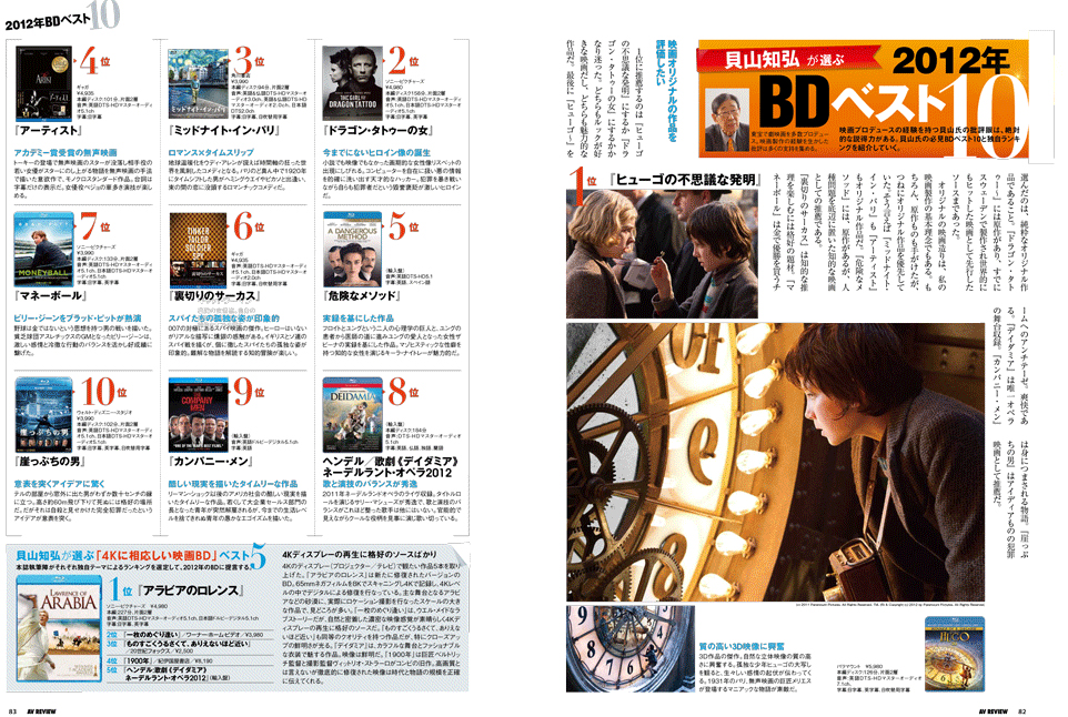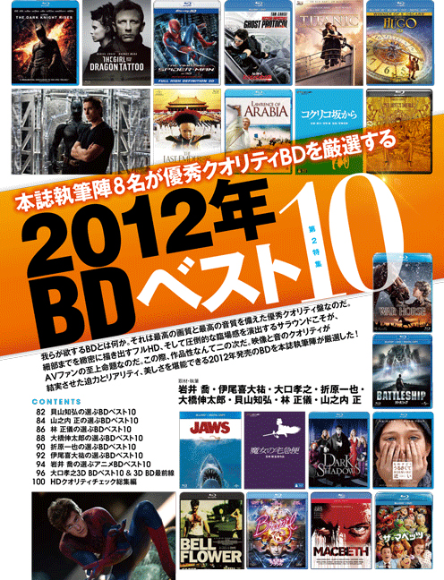 年に一度のプロジェクターの祭典「プロジェクター大全」の最新版が今年もやってきました。明るい部屋でカジュアルに楽しむ手軽なモデルから、家庭用プロジェクターの頂点に位置する4K対応モデルまで、6ブランド13モデルのプロジェクター群を一挙掲載。山之内正氏の主観評価に加えて、今回は高精度な業務用機器を用い投写映像の計測を行いました。AVレビューならではの濃厚&詳細レポートをご堪能下さい。 第2特集2012年BDベスト10