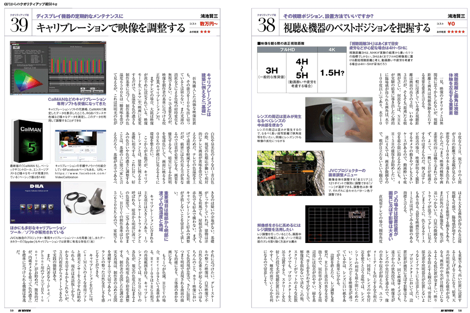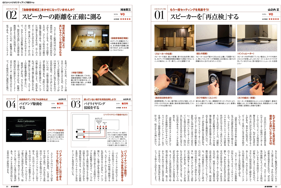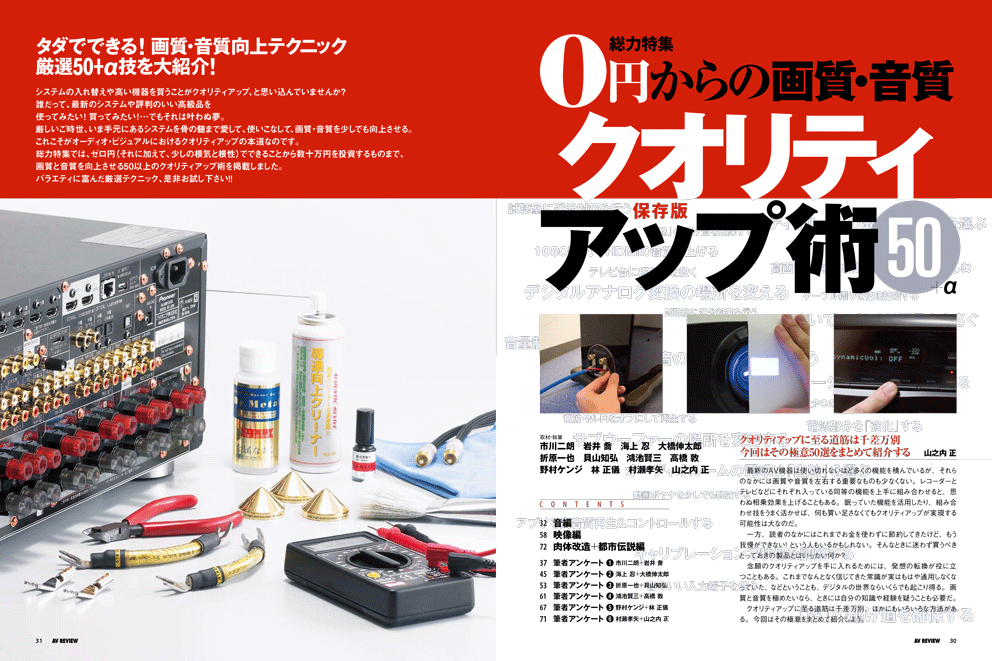 3月号AVレビュー3月号が16日に発売されました。今号の総力特集は「0円からの画質・音質 クオリティアップ術 50+α」です。AV機器さえ手元にあれば、誰もが実践できてしまう画質・音質向上テクニックを集めました! 第2特集は、オーディオの新たな潮流となりつつあるワイヤレス製品を徹底視聴した「ワイヤレスオーディオ完全ガイド」。そして巻頭特集では、ラスベガスで開催された家電ショーの詳報「CESで見た最新トレンド」です。AVレビュー3月号も是非お楽しみ下さい!! 総力特集0円からの画質・音質 クオリティアップ術50+α