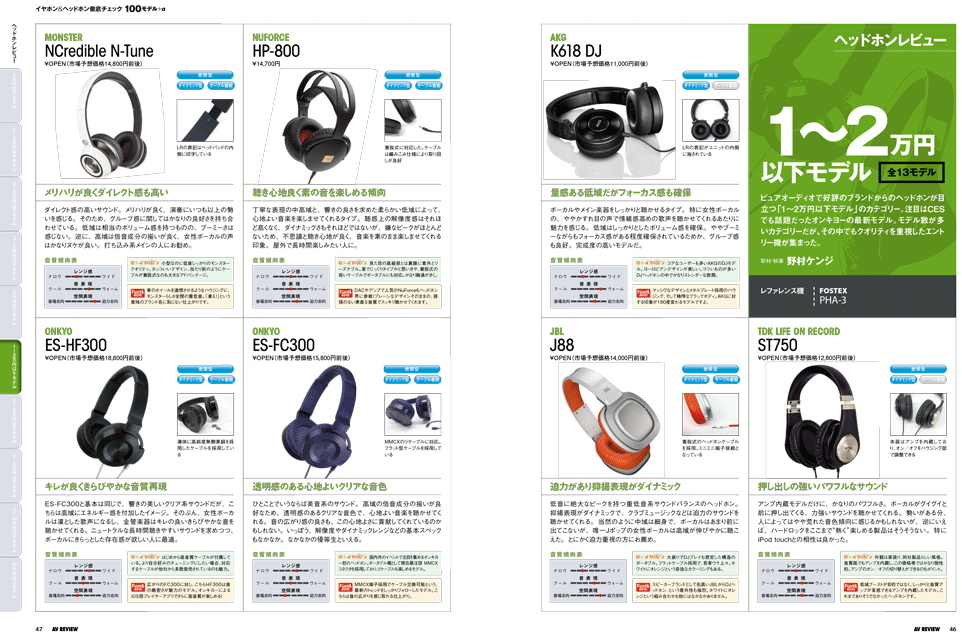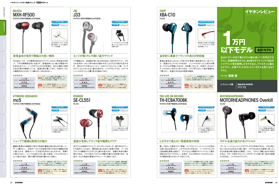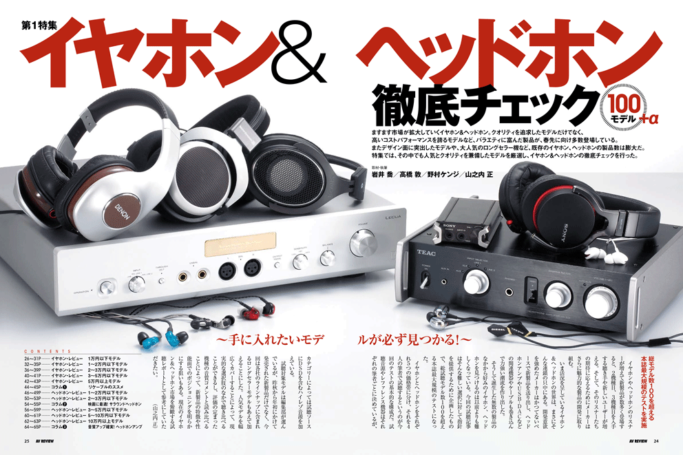 4月号AVレビュー4月号が16日に発売されました。今号の総力特集は「イヤホン&ヘッドホン 100モデル徹底テスト」です。大好評のイヤホン・ヘッドホン特集が2013年の新作モデルを引っさげてカムバック! 今回は本誌最大規模となる全108モデルを徹底チェックしています! 第2特集は、録画ユーザーが気になる“全録”モデルの実力を検証した「全録レコーダー/テレビ 全力テスト」。そして、安く、省スペースで大画面を手に入れるテクニックを探求する新連載「6畳100インチシアターへようこそ!」が今号からスタート。AVレビュー4月号を是非お楽しみ下さい!! 総力特集イヤホン&ヘッドホン 100モデル徹底テスト