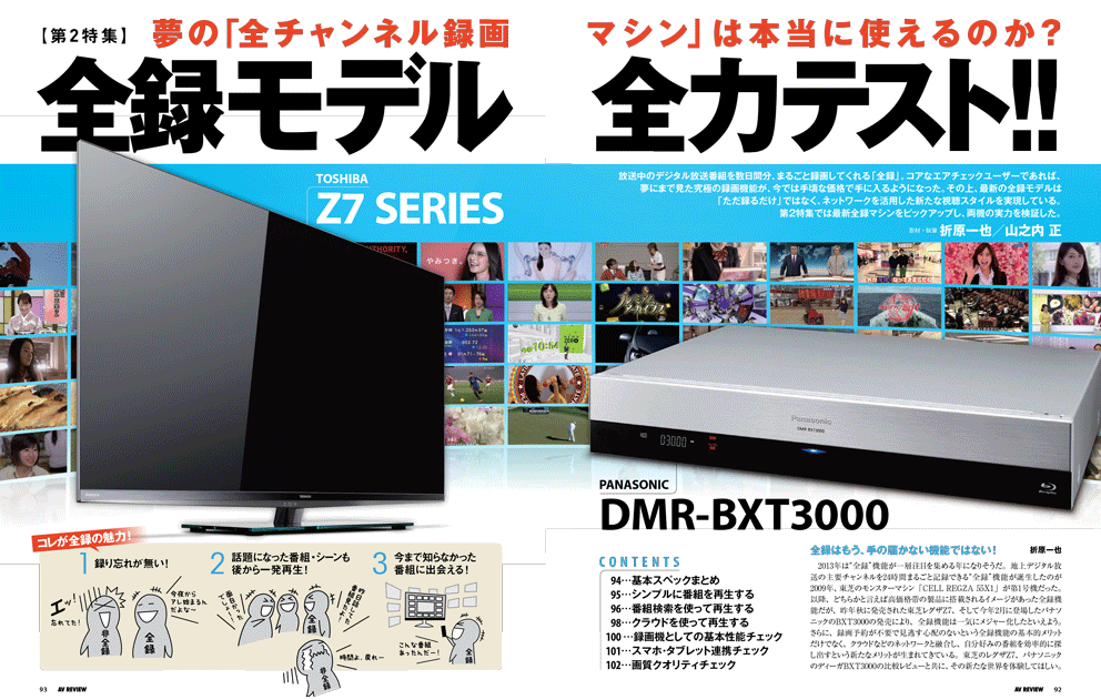 毎月のように新しいブランド・製品が登場するイヤホン&ヘッドホン市場。クオリティを追及するモデルはもちろんのこと、高いコストパフォーマンスを実現したモデルやデザイン性にも優れたモデルなど、2013年春も非常にバラエティに富んだ新製品が登場します。今回のイヤホン・ヘッドホン特集では、従来から人気のあるロングセラーモデルに加え、2013年春までに発売される新モデルを惜しみなく追加、総勢108ものイヤホン・ヘッドホンを集め、徹底的にその音質を検証しました。今購入できるイヤホン・ヘッドホンが俯瞰できる、本誌最大規模の試聴レポートをお楽しみ下さい! 第2特集全録レコーダー/テレビ 全力テスト