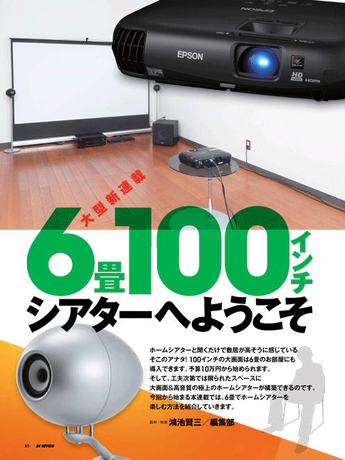 ホームシアターと聞いて「何だか、難しそう…」なんて思ってはいませんか? 実は100インチの大画面は6畳の部屋でも十分に実現できます。しかも予算は10万円で。そして工夫次第では、大画面と高音質を両立させた「極上ホームシアター」が6畳で構築できるのです。新生活のスタートに合わせて、ぜひ手に届く価格、省スペースで満足度の高いホームシアターを構築しましょう。 好評連載中