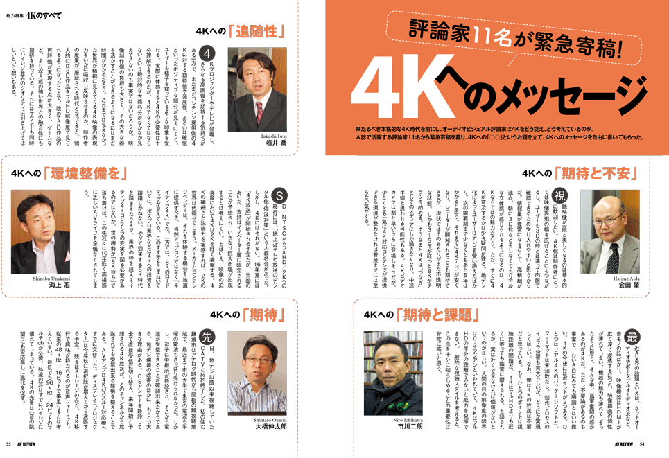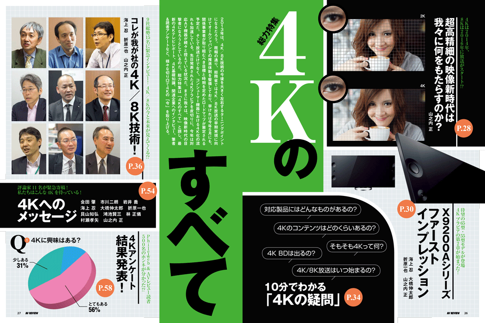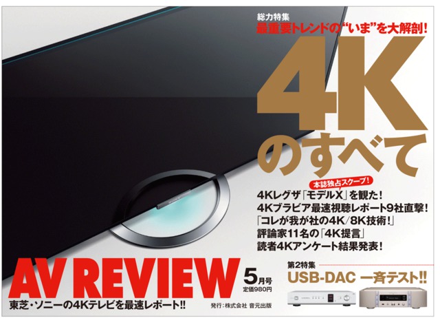 5月号AVレビュー5月号が17日に発売されました。総力特集は今年のオーディオ・ビジュアル界最大のトレンドである「4K」。先日発売されたソニーの4K BRAVIAの速報レポートはもちろん、キーパーソンへのインタビュー、Q&A、評論家による提言、読者に行った4Kアンケートの結果発表など、あらゆる角度から4Kの「今」に迫ります。第2特集では、新モデルが続々と登場しているUSB-DACをフィーチャー。手頃なモデルからハイエンドモデルまで、価格帯ごとに徹底比較視聴を敢行、ベストバイモデルを提示します。この他、本誌独占レポートとなる4Kレグザ「モデルX」の視聴レポート、新連載「伊尾喜大祐のアクターズファイル」など、見どころ満載!! AVレビュー5月号を是非お楽しみ下さい! 総力特集4Kのすべて