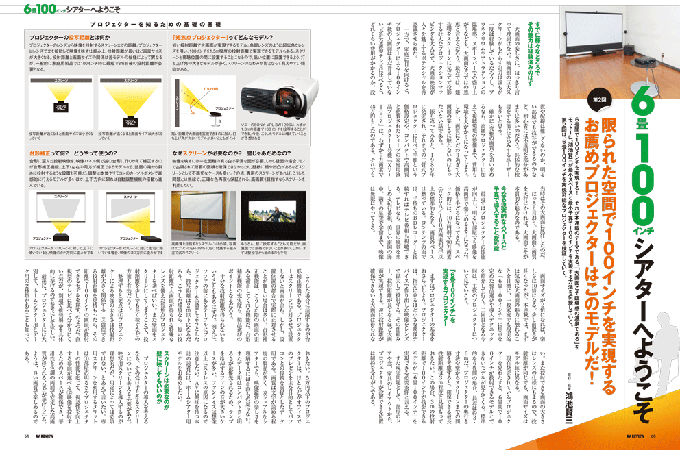 6畳間で100インチを実現する! 本連載では「大画面こそ臨場感の源泉である」をモットーに、鴻池賢三が最小スペースと最小予算で100インチを実現する方法を伝授します。第2回目は、6畳100インチを実現するためのプロジェクターを探します。 新連載スタート!伊尾喜大祐のアクターズファイル