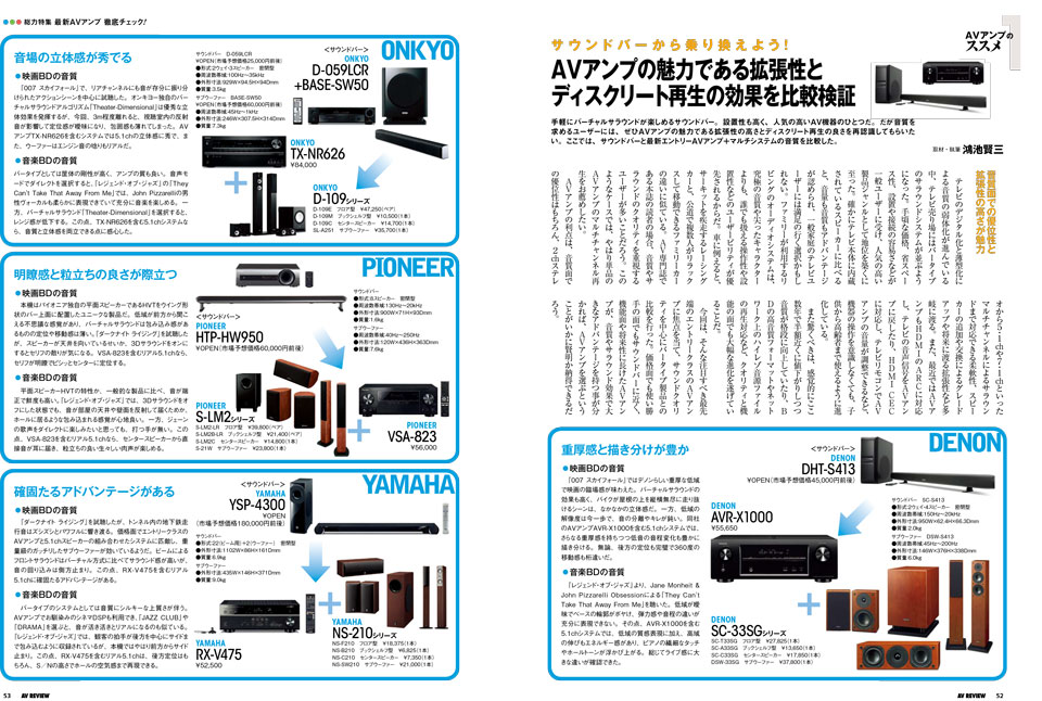 画像をクリックして拡大 6月号AVレビュー6月号が17日に発売されました。総力特集は、2013年の春夏モデルが勢揃いした「AVアンプ」です。AVアンプの基本中の基本である「2ch・マルチchの音質」チェックはもちろんこと、ハイレゾ対応、Bluetooth・AirPlayなどのワイヤレス再生対応など、先進の機能もしっかり比較検証しました。買って得するエントリー・ミドルクラスの15モデルを徹底比較した永久保存版です。第2特集では、最高の2Kテレビを選ぶ「フルHDテレビ トップモデル実力診断」です。4Kテレビはイイけれど、高くて買えない! そんな方には、いま成熟の2Kテレビが狙い目。でも、どれが一番の2Kテレビなのか? 東芝、ソニー、シャープ、パナソニックの最上位機を集めテストを行いました。この他、人気連載「6畳100インチシアターへようこそ!」、「伊尾喜大祐のアクターズファイル」など、見どころ満載です。AVレビュー6月号を是非お楽しみ下さい! 総力特集最新AVアンプ 徹底チェック!〜いま買いのモデルはコレだ!