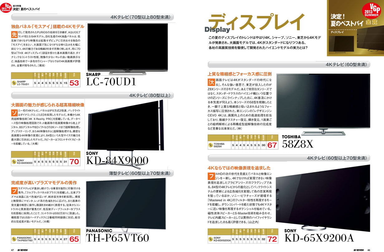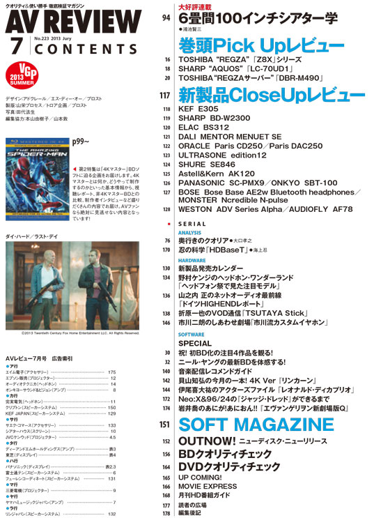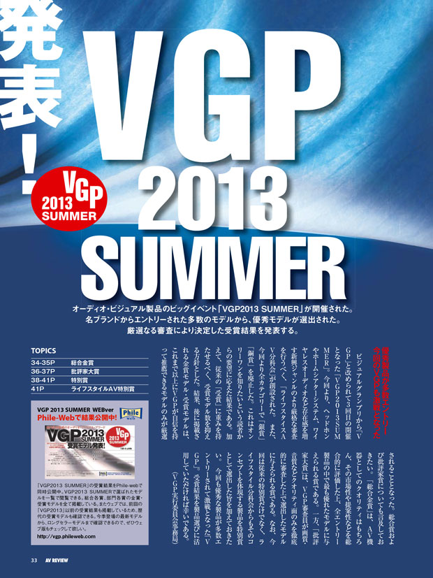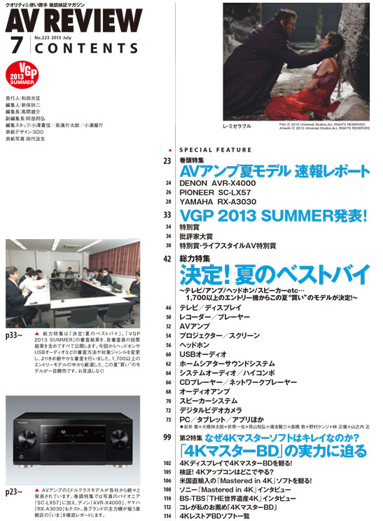 読者の皆様、関係者の皆様にお詫びして訂正いたします。 7月号AVレビュー7月号が17日に発売されました。総力特集は、2013年の上半期を飾るAV機器の祭典「決定! 夏のベストバイ」です。「VGP 2013 SUMMER」でエントリーされた約1700モデルの中から、本誌で活躍する10名の審査員がこの夏買いのモデルをセレクトしました。第2特集は「4KマスターBDの実力に迫る。」です。近年、4Kのデジタルカメラで撮影された映画や4Kでフィルムスキャニングされた映画のブルーレイソフトが増えつつあります。4Kをマスターにしたブルーレイソフトとは? そしてその実力とは? 気になる最新の高画質BDをレポートしました。そして巻頭には、デノン・パイオニア・ヤマハの最新AVアンプを取り上げた「AVアンプ夏モデル速報レポート」。注目のミドル&ハイクラスのAVアンプが気になっている方、必見です! この他、人気連載「6畳100インチシアターへようこそ!」、「伊尾喜大祐のアクターズファイル」など、見どころ満載。AVレビュー7月号を是非お楽しみ下さい! 総力特集VGP 2013 SUMMER 結果発表!