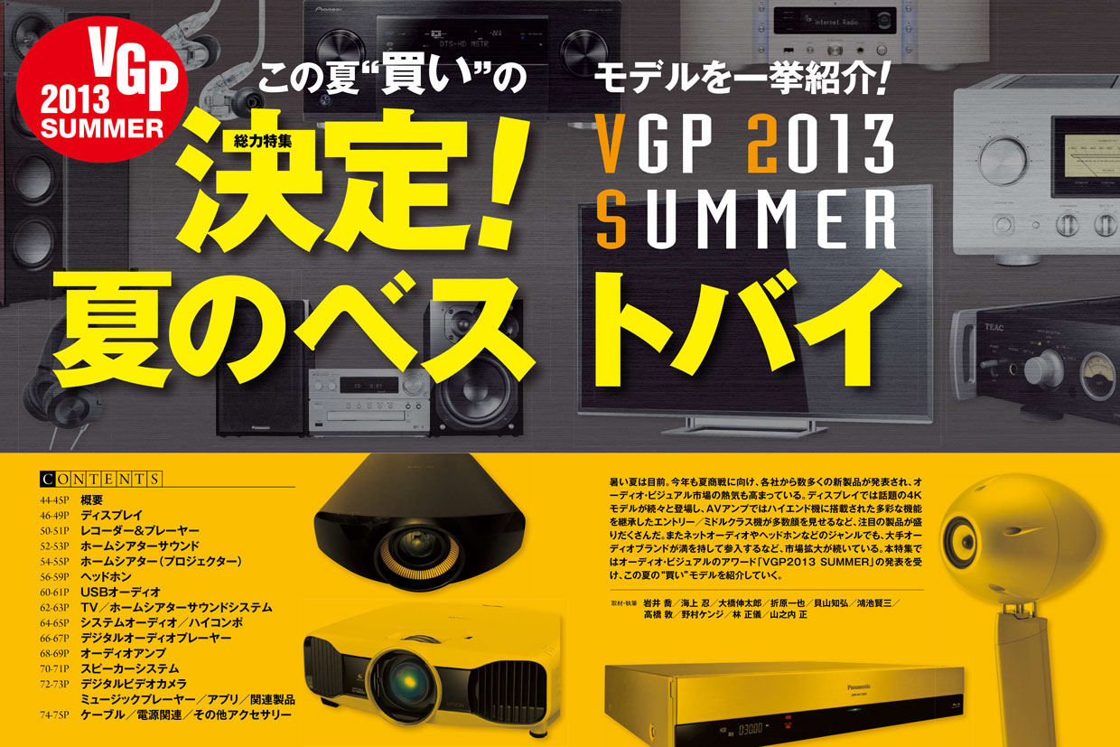 決定! 夏のベストバイ?いま“買い”のモデルを一挙紹介! オーディオ・ビジュアル機器の祭典「VGP 2013 SUMMER」が開催されました。約1700モデルを越えるエントリーモデルの中から、評論家および審査店が審議を重ね、総合金賞、批評家大賞、特別賞など各賞に相応しいモデル群を選出しています。優秀モデルが激戦を繰り広げた、VGP 2013 SUMMERの模様を受賞結果とともに発表します。 巻頭特集AVアンプ夏モデル速報レポート