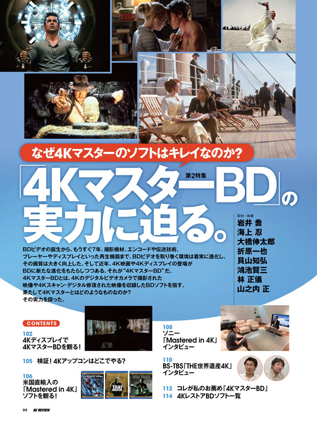 BDビデオの誕生から、もうすぐ7年になります。撮影機材、エンコードや伝送技術、プレーヤーやディスプレイなどの再生機器まで、BDビデオを取り巻く環境は着実に進化し、その画質は大きく向上しました。そして近年、4K映画や4Kディスプレイの登場がBDに新たな進化をもたらしつつあります。それが「4KマスターBD」です。4KマスターBDとは、4Kのデジタルビデオカメラで撮影された映像や4Kスキャン・デジタル修復された映像を収録したBDソフトのことです。果たして4KマスターBDとはどのようなものなのでしょうか? 第2特集では、その実力に迫りました。 好評連載中