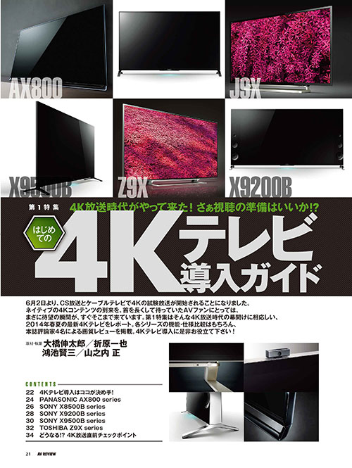 「はじめての4Kテレビ導入ガイド」 2014年6月2日より、CS放送とケーブルテレビで4Kの試験放送が開始されることになりました。ネイティブの4Kコンテンツの到来を、首を長くして待っていたAVファンにとっては、まさに待望の瞬間が、すぐそこまで来ています。第1特集はそんな4K放送時代の幕開けに相応しい、2014年春夏の最新4Kテレビをレポート。各シリーズの機能・仕様比較はもちろん、本誌評論家4名による画質レビューを掲載。4Kテレビ導入に是非お役立てください! 第2特集ハイレゾも"今すぐ"楽しめる