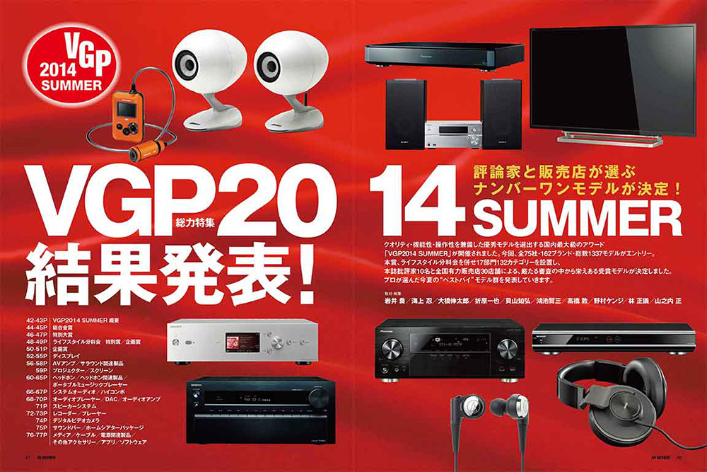 「VGP2014 SUMMER 結果発表!」 クオリティ・機能性・操作性を兼備した優秀モデルを選出する国内最大級のアワード「VGP2014 SUMMER」が開催されました。今回、全75社・162ブランド・総数1337モデルがエントリー。本賞、ライフスタイル分科会を併せ17部門132カテゴリーを設置し、本誌批評家10名と全国有力販売店30店舗による、厳たる審査の中から栄えある受賞モデルが決定。プロが選んだ今夏の"ベストバイ"モデル群を発表していきます。 特別記事VGP2014 SUMMER