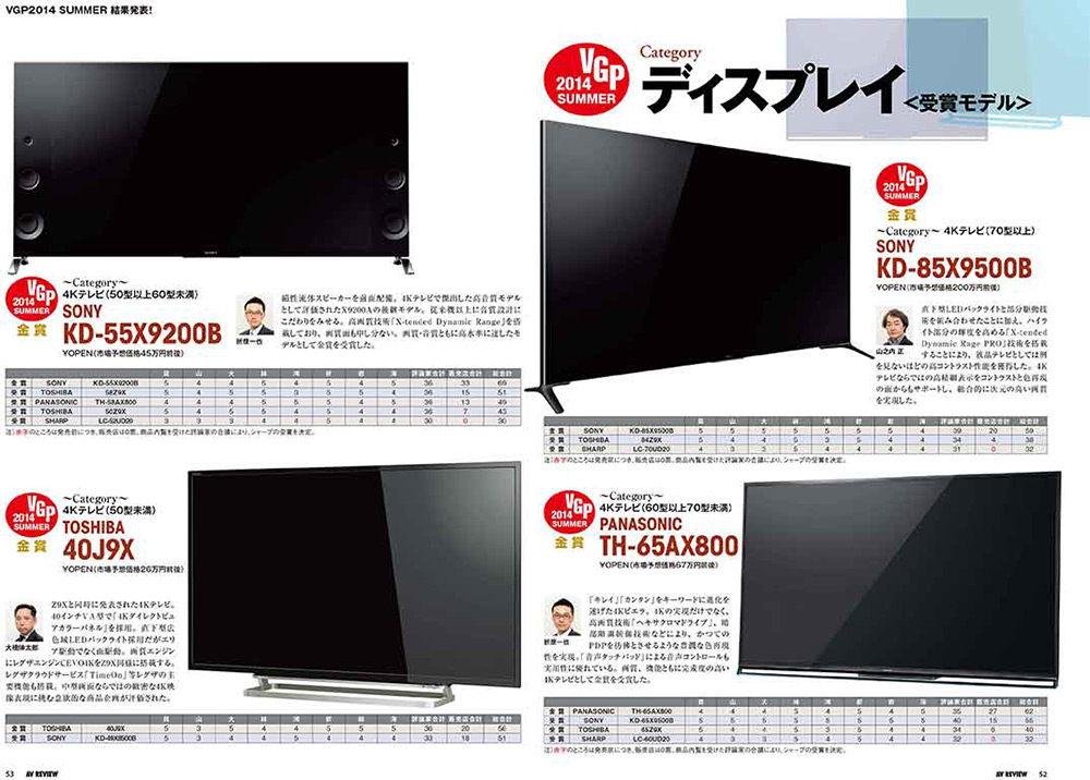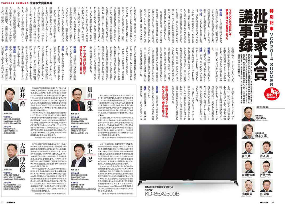 「批評家大賞議事録」 VGP2014 SUMMERにおいて、審査員8名の合議により優れた製品に授与される「批評家大賞」の審議会が開催されました。今回で17回目を数える批評家大賞には、ソニーの4Kテレビ「KD-65X9500B」が受賞。本稿では、審議会議事録として、受賞までの経緯、及び審議会で交わされた審査員の発言などを掲載しています。 巻頭特集4K試験放送の詳細をチェック