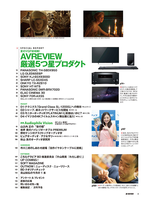 最新テレビからAVアンプまで登場! 今号の「AV REVIEW 厳選5つ星プロダクト」は、注目モデルが盛り沢山。パナソニック「TH-65DX950」、ソニー「KJ-65X9300D」などの最新4Kテレビ、オンキヨーのAVアンプ「TX-RZ810」など、今春から今夏に掛けて話題のモデルを徹底チェックしました! 人気連載「市川二朗のしあわせ劇場」