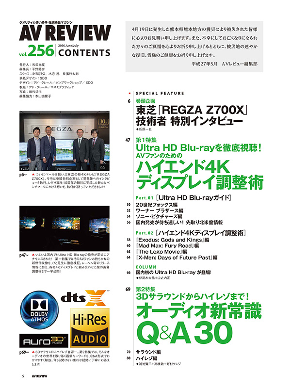 Vol.256 2016年7月号次世代ディスク「Ultra HD Blu-ray」から最新の「ハイレゾ」事情まで、AVファンの最注目情報が満載のAVレビュー Vol.256(2016年7月号)は5月17日発売です。第1特集「ハイエンド4Kディスプレイ調整術」は、国内4Kブルーレイ情報とディスプレイ調整術、4Kブルーレイの最新情報をお届けします。第2特集「オーディオ新常識 Q&A30」は、次世代サラウンドやハイレゾの基礎知識を掲載しています。巻頭企画では、東芝REGZA Z700Xの開発者に特別インタビューを実施。「AV REVIEW 厳選5つ星プロダクト」、「Audiophile Vision」、「市川二朗のしあわせ劇場」など、連載記事も満載です。今号もAVレビューをお楽しみください! 第1特集4Kブルーレイをとことん楽しむ!