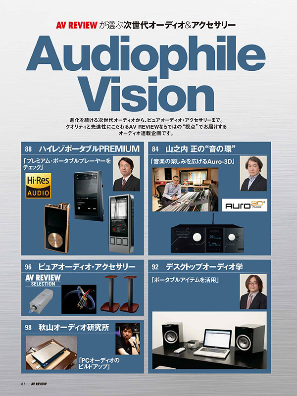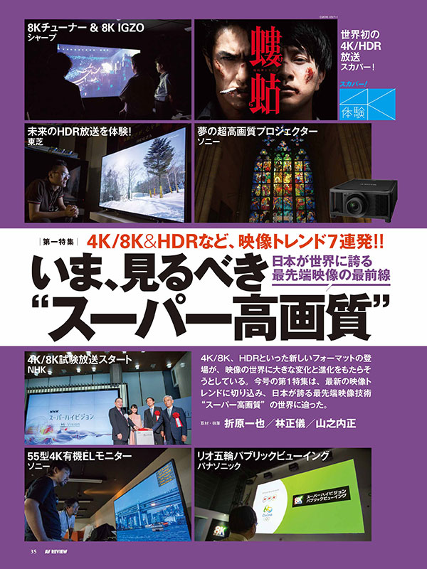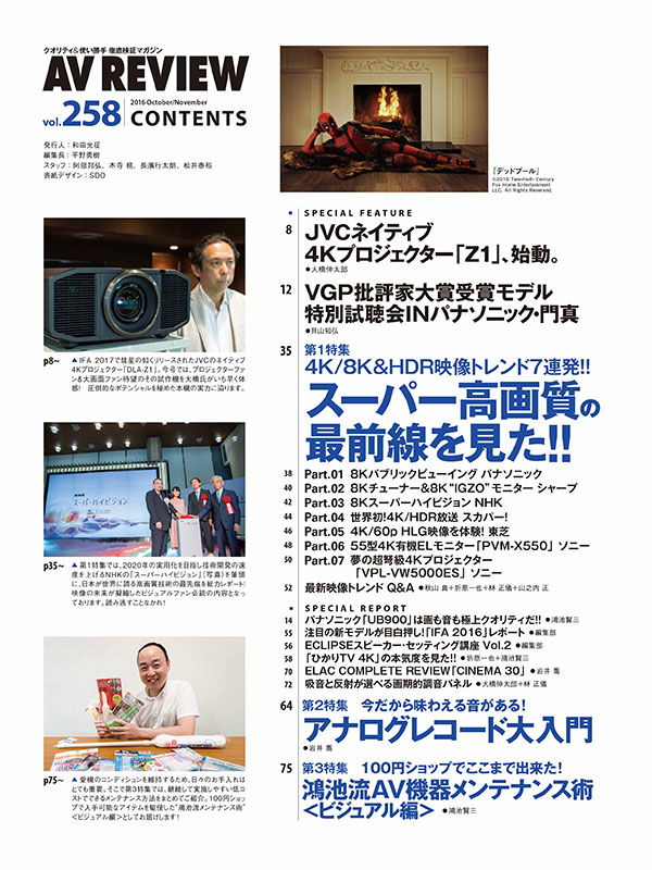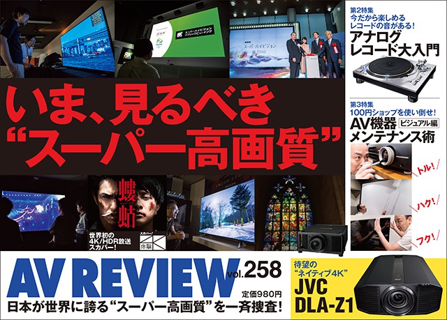 Vol.258 2016年11月号高画質技術の最前線である「4K/8K」「HDR」から、オーディオのトレンドである「ハイレゾ」、人気再燃の「アナログレコード」まで、AVファンが知りたい深みのある情報が詰まったAVレビュー Vol.258(2016年11月号)は9月17日発売です。第1特集「スーパー高画質の最前線を見た!!」は、日本が世界に誇る4K/8K、HDRの最先端技術を”7連発”で紹介します。高音質技術が進化したからこそ楽しめるアナログレコードの音がある現在、第2特集「アナログレコード大入門」では、これからアナログレコードを始めるのに知って得する情報をお届けします。第3特集「鴻池流AV機器メンテナンス術」は、AVシステムの性能を最大限に引き出すため、100円でもできるメンテナンス術を紹介しています。「AV REVIEW 厳選5つ星プロダクト」、「市川二朗のしあわせ劇場」、「6畳100インチシアター学」など連載記事も満載です。今号もAVレビューをお楽しみください。 第1特集「4K/8K」から「HDR」まで、映像トレンド7連発!