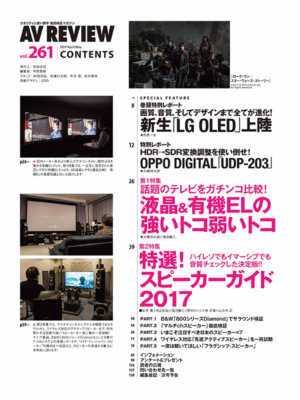<お詫びと訂正> AV REVIEW Vol.261(2017年5月号)にて誤りがございました。 ・76P 特集「特選!! スピーカーガイド2017」の記事にて誤りがございました。YAMAHA「NS-5000」の価格が「¥1,000,000(税抜/ペア)」となっておりますが、正しくは「¥1,500,000(税抜/ペア)」となります。 読者の皆様、関係者の皆様にお詫びして訂正いたします。 Vol.261 2017年5月号オーディオ・ビジュアルのトレンドである4K/HDR、Ultra HDブルーレイ、OLEDから、ハイレゾやアナログレコードまで、AVファン必見の情報が満載のAVレビュー Vol.261(2017年5月号)は3月17日発売です。第1特集「液晶&有機ELの強いトコ弱いトコ。」では、テレビで今話題の両方式をガチンコチェックしています。第2特集「特選! スピーカーガイド2017」は、イマーシブサウンドのシステムを組むのに最適なスピーカーの徹底クオリティチェックを実施。巻頭特別レポートには、LGの最新有機ELテレビのファーストインプレッション、そしてUltra HDブルーレイ対応のユニバーサルプレーヤーとして注目を集めているOPPO DIGITAL「UDP-203」の使いこなしレビューをお届けします。「市川二朗のしあわせ劇場」など人気連載、また新連載の「オーディオ“旬感”ビギナーズガイド」も掲載中です。今号もAVレビューをお楽しみください! 第1特集“液晶”と“有機EL”、どっちが良い?