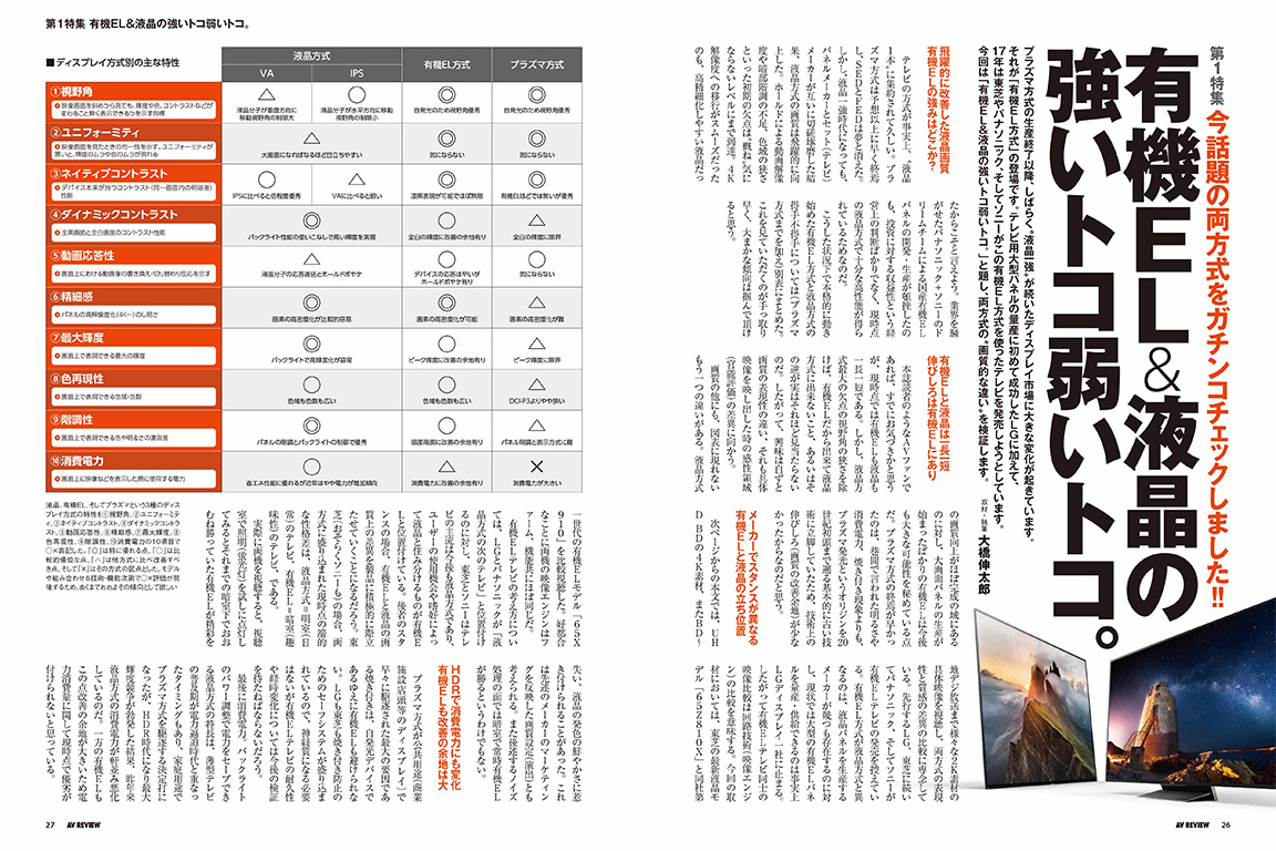 「液晶&有機ELの強いトコ弱いトコ。」 プラズマ方式の生産終了以降、しばらく“液晶一強”が続いたディスプレイ市場に大きな変化が起きています。それが「有機EL方式」の登場です。テレビ用大型パネルの量産に初めて成功したLGに加えて、17年は東芝やパナソニック、そしてソニーがこの有機EL方式を使ったテレビを発売しようとしています。今回は「有機EL&液晶の強いトコ弱いトコ。」と題し、両方式の“画質的な違い”を検証します! 第2特集“ハイレゾ”から“イマーシブ”までチェック!