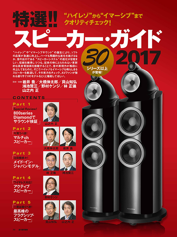 「特選! スピーカーガイド2017」 “ハイレゾ”や“イマーシブサウンド”の誕生により、ソフトの品質が急速に向上し、ハードも飛躍的な進化を遂げるなか、音の出口である“スピーカーシステム”の進化が目覚ましいです。伝統を継承しつつも、従来の枠にとらわれない革新的な高音質技術を搭載することで、音の表現力が格段に向上してきます。そこでハイレゾもイマーシブも鳴らしきるスピーカーを厳選して、その実力をチェック。AVファンが惚れる選りすぐりのモデルをとくと堪能して頂きたいです! SPECIAL FEATURE最新世代有機ELパネルを最速投入!