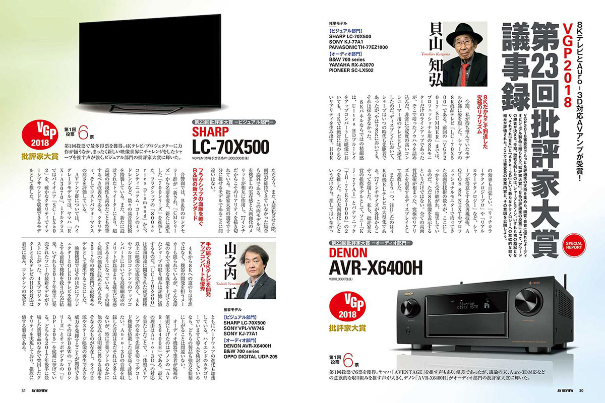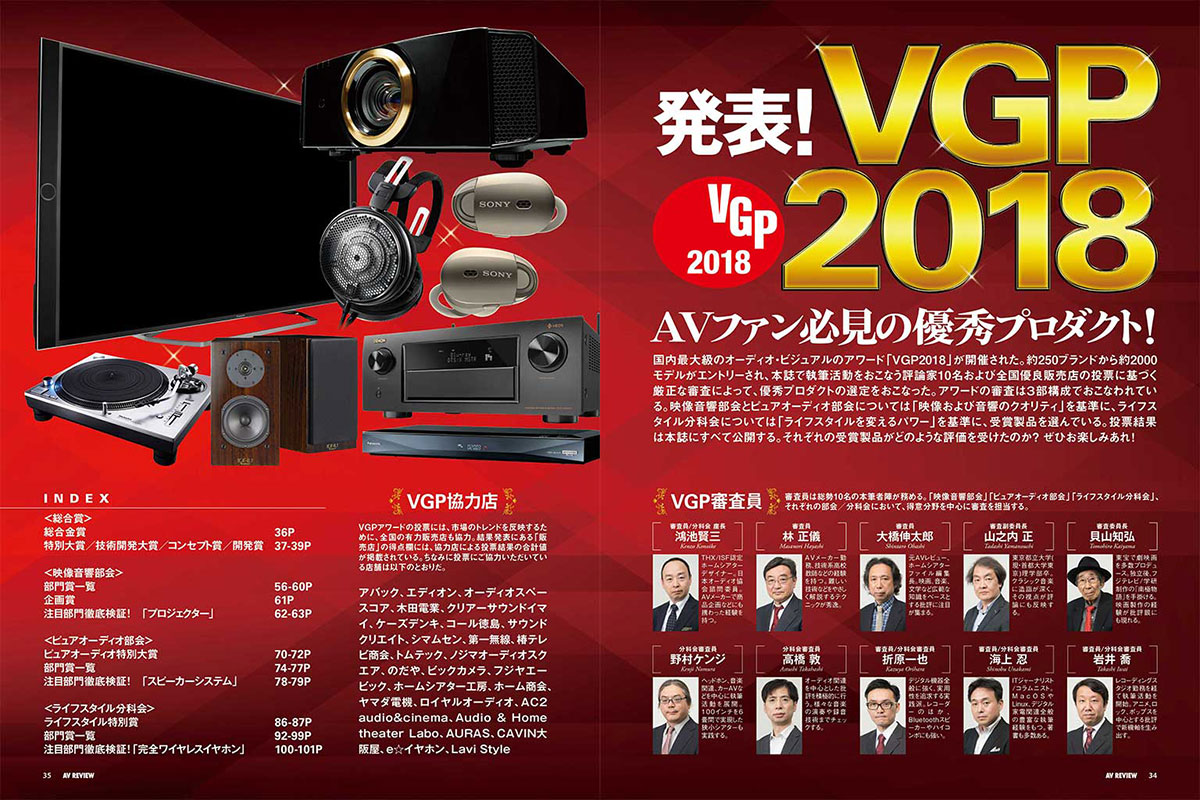 ベストオブベスト発表!VGP2018 国内最大級のオーディオ・ビジュアルのアワード「VGP2018」。今期は約250ブランドから約2000モデルがエントリーされ、VGP評論家10名及び全国有料販売店の投票に基づく厳正な審査によって、優秀プロダクトの選定がおこなわれました。アワードは、映像および音響のクオリティを基準に選定される「映像音響部会」と「ピュアオーディオ部会」、そして、より豊かなライフスタイルを基準に選定される「ライフスタイル分科会」の3部構成でお届け。全受賞モデルの投票結果も読めるのは本誌ならではの魅力もお楽しみください! SPECIAL FEATUREVGP評論家が決める