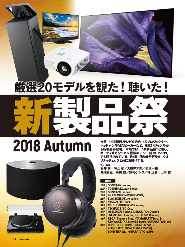 2018年秋のAV新製品を大紹介 今秋、4K有機ELテレビを始め、4Kプロジェクター、ヘッドホンやAIスピーカーなど、幅広いジャンルから新製品が登場。本特集では“新製品祭”と題して、国内最大級を誇るオーディオビジュアル機器のアワード「VGP20019」でも期待されている、絶対注目の新モデルを、クオリティチェックと共にお届けします。 第1特集売れ筋モデル×注目コンテンツ