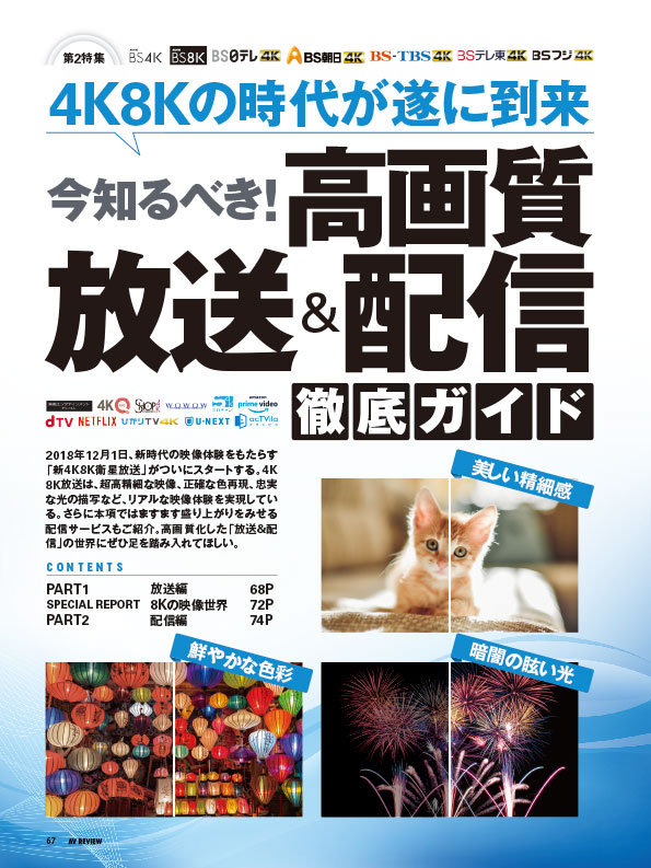高画質な放送&配信を徹底ガイド 2018年12月1日、新時代の映像体験をもたらす「新4K8K衛星放送」がついにスタートします。4K8K放送は、超高精細な映像、正確な色再現、忠実な光の描写など、リアルな映像体験を実現しています。さらに、ますます盛り上がりをみせる配信サービスもご紹介。高画質化した新世代となる「放送&配信」の今を徹底解説します。 連載超弩級! JVCの8Kプロジェクターや