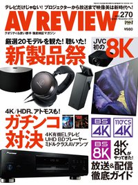<お詫びと訂正> AV REVIEW Vol.270(2018年10/11月号)にて誤りがございました。 ・75P 「今知るべき! 高画質 放送&配信 徹底ガイド」の記事にて誤りがございました。U-NEXTの4K動画視聴の推奨回線速度「3Mbps」となっておりますが、正しくは「25Mbps」となります。 ・125P 「BDクオリティチェック」の記事にて誤りがございました。作品名が『サテリンコ』となっておりますが、正しくは『サテリコン』となります。 読者の皆様、関係者の皆様にお詫びして訂正いたします。 Vol.270 2018年10月/11月号4K8K放送開始を目前に控え、ますます盛り上がりをみせる4K有機ELテレビや4Kプロジェクター、また臨場感あふれるイマーシブサウンドを実現するスピーカーシステムやAVアンプまで、秋の新製品が大豊作です。巻頭特集は「新製品祭 2018 Autumn」と題し、今秋に注目すべき「厳選20モデル」を本誌執筆陣が隈なくチェック! 渾身のレビューをお届けします。 そして第1特集「相性ガチンコ検証 売れ筋モデル×注目コンテンツ」では、AVファンの話題を集めたトレンドモデル群と必見・必聴ソフトを組み合わせて検証。これを読めばハードとコンテンツの相性が一目でわかります。 第2特集には、いよいよ12月1日にスタートする4K8K放送に先駆けて「今知るべき!高画質 放送&配信 徹底ガイド」をお届け。4K8K放送はもちろん、各社さまざまな提案で人気を集める動画配信も解説。さらなる高画質化を実現した放送と配信の“今”に迫ります。Special Newsも注目。JVCからは民生機初となる8Kプロジェクター、ヤマハからはAVプリ/パワーアンプのフラグシップモデルが登場するなど、オーディオビジュアルをさらに盛り上げる超弩級モデルの第一報をお伝えします。「鴻池賢三の6畳100インチシアター学」、「市川二朗のしあわせ劇場」など、人気連載記事も掲載中です。秋の夜長にじっくりと読みたい製品情報や4K8K放送情報が盛りだくさんのAVレビュー最新号Vol.270は9月15日(土)発売です。ぜひお楽しみください! 巻頭特集厳選20モデルを観た!聴いた!