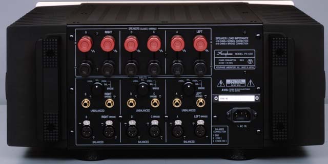 PX-600のリアパネル。本機ではフロント左右のチャンネルをLEFT/RIGHTと表示し、サラウンドチャンネルはA/B、フロントセンターをC、サブウーファーをDと表示している。ブリッジ接続の際にはLEFT+A、RIGHT+B、C+Dで3系統になる |