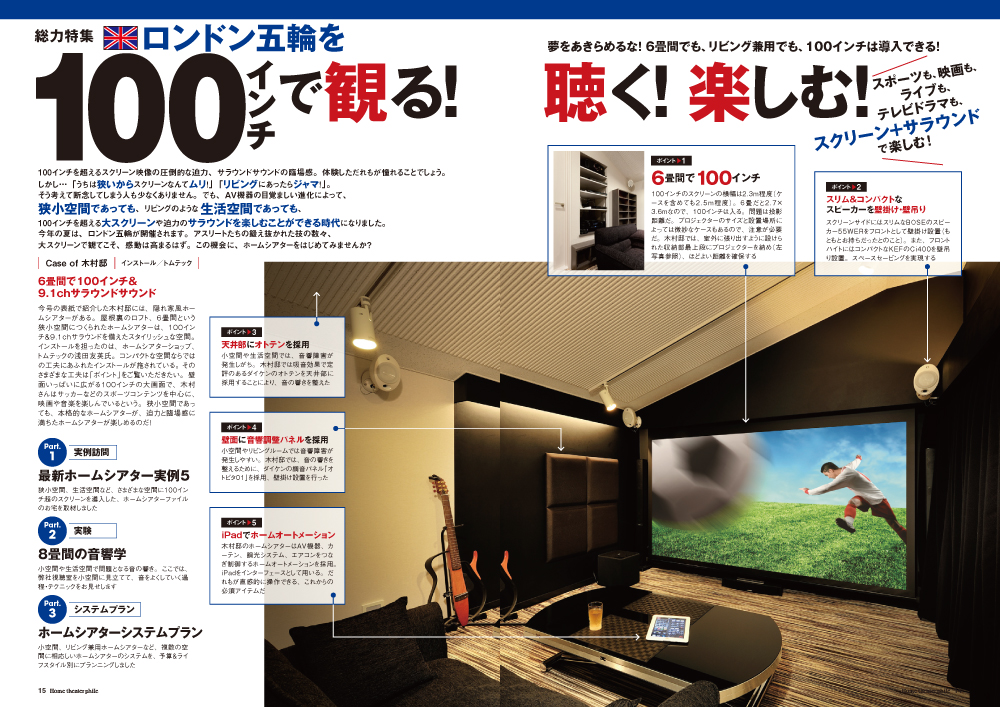 「うちは狭いからスクリーンなんてムリ!」「リビングにあったらジャマ!」と断念している方々にこそ知っていただきたいのは、どんな空間であっても100インチを超えるホームシアターは構築可能ということ。今夏はロンドン五輪が開催されます。アスリートたちの鍛え抜かれた技の数々は大スクリーンで楽しんでこそ。今こそ、ホームシアターをはじめてみませんか?