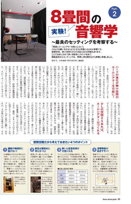 個室にホームシアターを導入する場合、ネックのひとつになるのが音響です。密閉空間、狭小空間だから引き起こされる諸問題と回避策とは…。日本に多い8畳間にスポットをあて、機器設定からセッティングまで実際に音を聴きながら実験、考察しました。