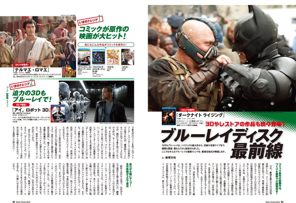 大画面とサラウンドを楽しむホームシアターでは、画質・音質に優れたクオリティのよいブルーレイを満喫したいもの。そこで、年末年始に観たいホームシアターにぴったりなベストバイ作品をご紹介します。「いま大画面で見るべきベストクオリティディスクTop30」では、ブルーレイの魅力を知り尽くした大橋伸太郎氏と堀切日出晴氏が今年を代表するクオリティのよいブルーレイを厳選。洋画からリマスター、アニメ、音楽まで幅広く推薦してくれました。ほかにも、ブルーレイの最新トレンドや新作情報、編集部お薦めの2012年ブルーレイカタログなど盛りだくさん。ぜひお気に入りのブルーレイを見つけてください。