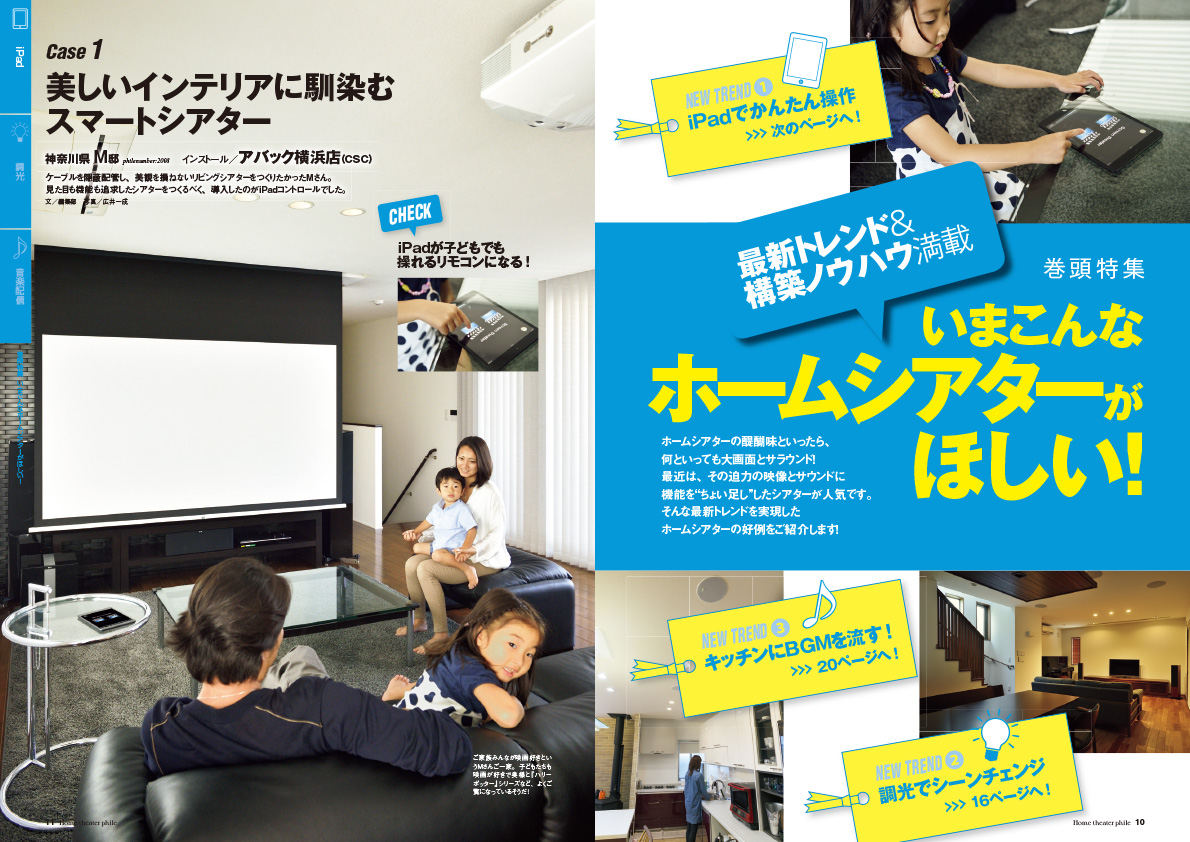 ホームシアターの醍醐味といったら、何といっても大画面とサラウンド! 最近は、その迫力の映像とサウンドに、「iPadでかんたん操作」や「家庭内音楽配信」などの機能を“ちょい足し”したシアターが人気です。そんな最新トレンドを実現したホームシアターの好例をご紹介します。 これからホームシアターをつくる方、必見です!