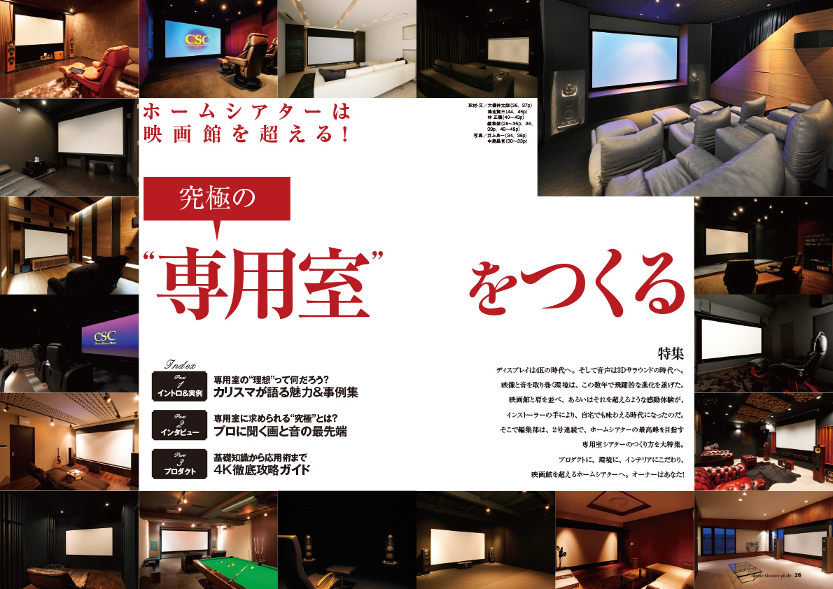ディスプレイは4Kの時代へ、そして音声は3Dサラウンドの時代へ。映像と音を取り巻く環境は、この数年で飛躍的な進化を遂げました。映画館と肩を並べ、あるいはそれを超えるような感動体験が自宅でも味わえる時代になりました。そこで編集部は、2号連続で、ホームシアターの最高峰を目指す専用室シアターのつくり方を大特集していきます。ご一緒に、映画館を超えるホームシアターをつくりましょう!