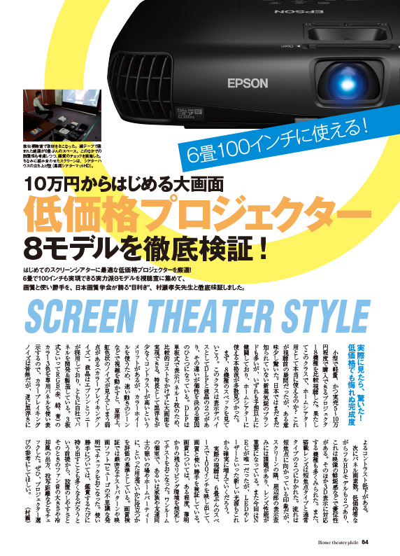 低価格プロジェクターの徹底比較視聴と具体的なシステムプランをご紹介。さらにプロのホームシアターインストーラーが手がけた、6畳間100インチの傑作シアター事例も取材しました。