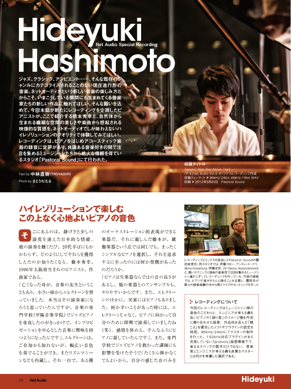 こちらは、注目の若手ピアニスト、Hideyuki Hashimoto(橋本秀幸)のピアノ・ソロ音源。収録は東京・世田谷にあるレコーディングスタジオ「Pastoral Sound」。Hideyuki Hashimotoの感性豊かなピアノが、アコースティック録音に定評のあるPastoral Soundならではの音作りで収録されています。収録曲はこの12月発売の新譜『Air』にも収録される「ayumi」の本誌オリジナルバージョンと、未発表曲「P.S」の2曲を96kHz/24bit WAVと48kHz/16bit WAVにてご用意しております。