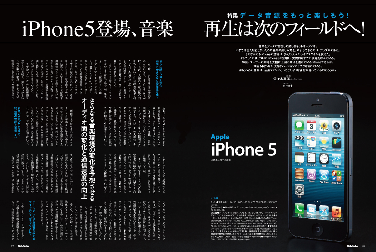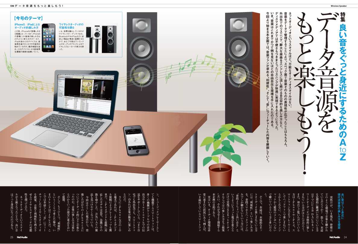 今号より始まる特集「データ音源をもっと楽しもう!」。本企画は“音と利便性の実現”をテーマとして、“手軽に高音質で楽しめるネットオーディオスタイル”を提案して参ります。今回は、いま世間を賑わしているiPhone5がオーディオに与える影響やこれまでの機器が使用できるのかどうかを検証。そしてもうひとつ、大きな変革を見せる音に妥協しないワイヤレス再生について、一斉試聴を行っています。