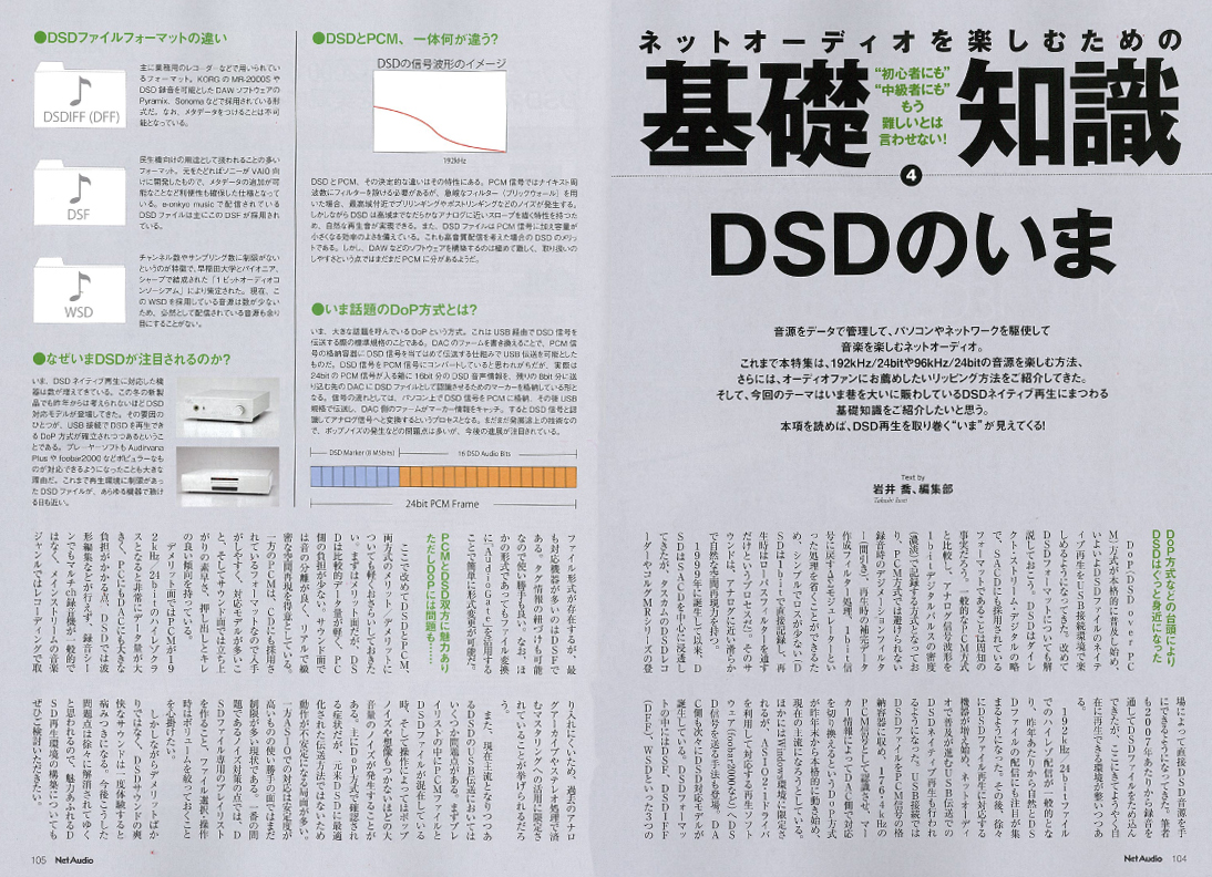 いま、ネットオーディオファンの間で最も大きなトピックスとなっているDSDネイティブ再生。この冬には多くの対応モデルも登場し、ますます大きな盛り上がりを見せています。今回の基礎知識はその「DSDのいま」にフォーカス。DSDとPCMの違いはもちろん、話題となっているDoP方式についてやその設定の手順、さらにはDSDネイティブ再生のメリットや現時点での問題点まで、DSDにまつわる基礎を徹底してレポートしております。また、いまDSDネイティブ再生に対応している主要な機器を一斉試聴したレポートも掲載。DSDネイティブ再生にまつわる「いま」を知るには必読の内容となっております。