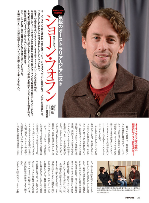 これまで数々の高音質作品をリリースし、音にこだわる音楽ファン達から高い評価を獲得しているティートックレコーズ。その透明度の高い録音もさることながら、昨今では世界中から次世代を担うミュージシャンを見つけ出し作品をリリースするなど、その勢いはとどまるところを知りません。今回の付録音源に収録されたのは、オーストラリア人ピアニスト、ショーン・フォラン。ティートックスタジオにて観客を前にして録音するという、ライヴ録音とスタジオ録音の異なる2要素を盛り込んで収録された本作は、その現場のリアリティと緊迫感、そしてショーンならではの世界観を見事に引き出した音源へと仕上がっております。