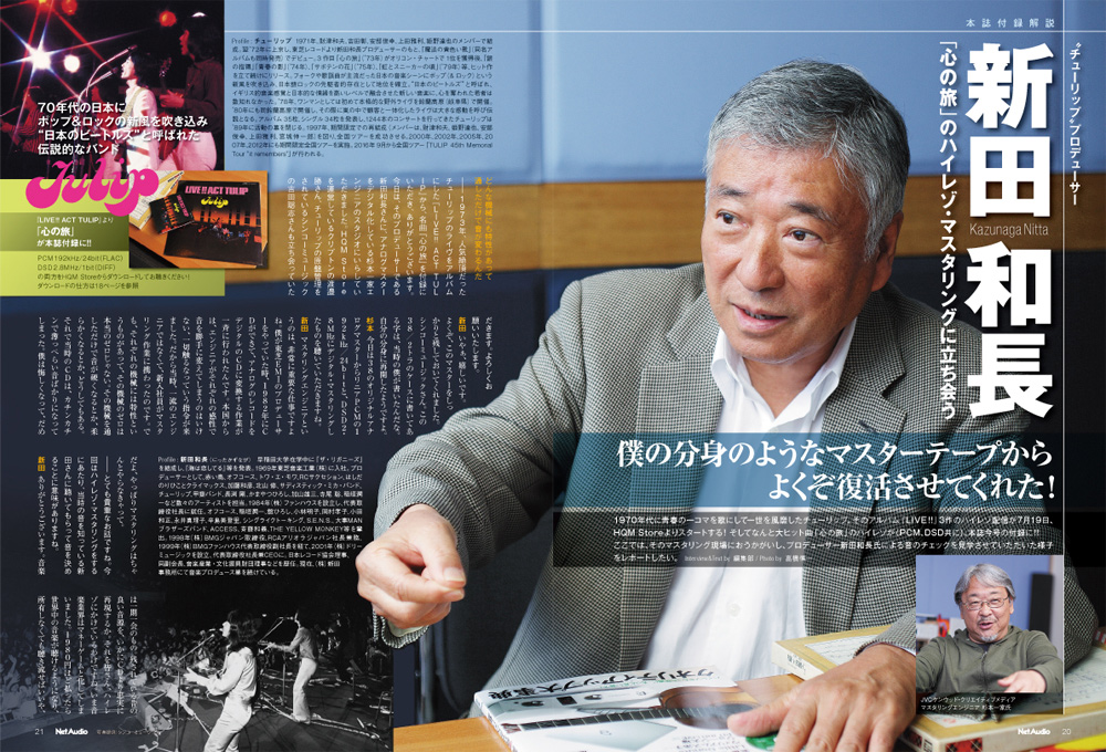日本のポピュラー音楽シーンを語るにあたり、欠かすことのできない重要バンド、チューリップ。「日本のビートルズ」とも言われるなど、日本のロックを大きく変えたチューリップの作品のなかでも名盤として名高い『LIVE!! ACT TULIP』が、なんとハイレゾ・リマスタリングでリリース決定! その中から本誌付録として「心の旅」を192kHz/24bit、DSD 2.8MHzで収録いたしました。誌面では、チューリップを手がけた名プロデューサー、新田和長氏も立ち会ったマスタリングの現場をレポート! 当時のお話やハイレゾ時代となったことによる新しい可能性を思う存分語っていただいております。ぜひ、フルアルバムと合わせてお楽しみください。