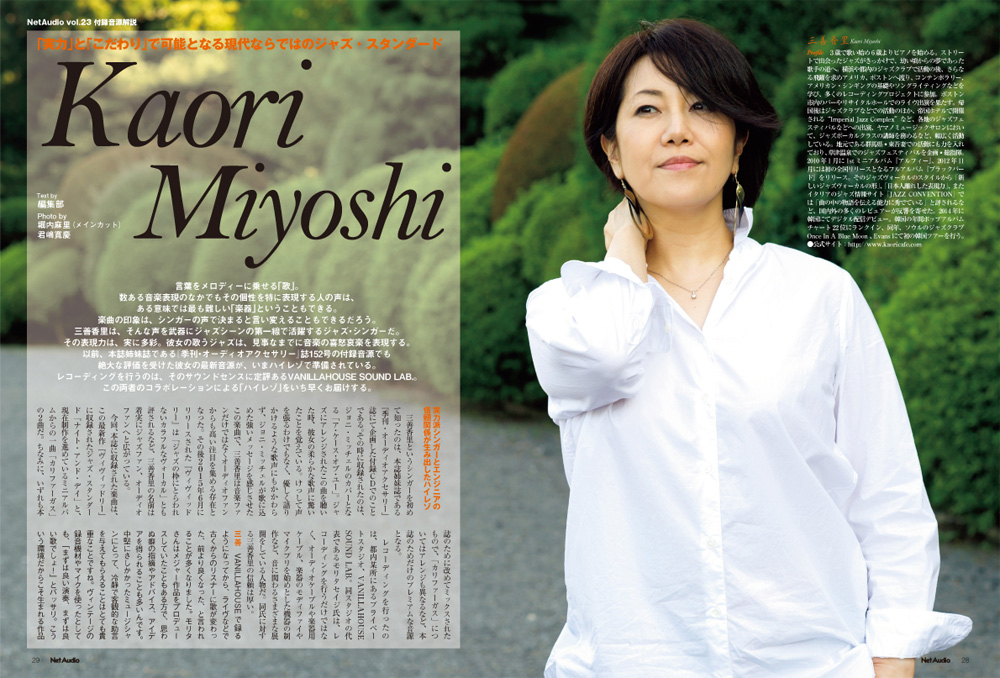 正統派ジャズシンガーとして、日本のみならず韓国やイタリアなど世界各国のジャズシーンで高い評価を受ける三善香里。本誌姉妹誌の季刊・オーディオアクセサリー152号の付録音源にてオーディオファンからの評価も確固たるものとした彼女の最新音源が、なんとネットオーディオ誌の付録に登場! レコーディングを行ったのは、東京都・大田区にあるプライベートスタジオ、VANILLAHOUSE SOUND LAB.。同スタジオのモリタセイジ氏による独創的なサウンドメイキングで収録されたスタンダード曲は、三善香里の実力を存分に引き出した仕上がりとなっております。収録されたのは最新アルバム『Vividly』からの1曲と録り下ろし楽曲の計2曲。ほかでは聴けない、魅惑のジャズ・ヴォーカルの世界は必聴です。