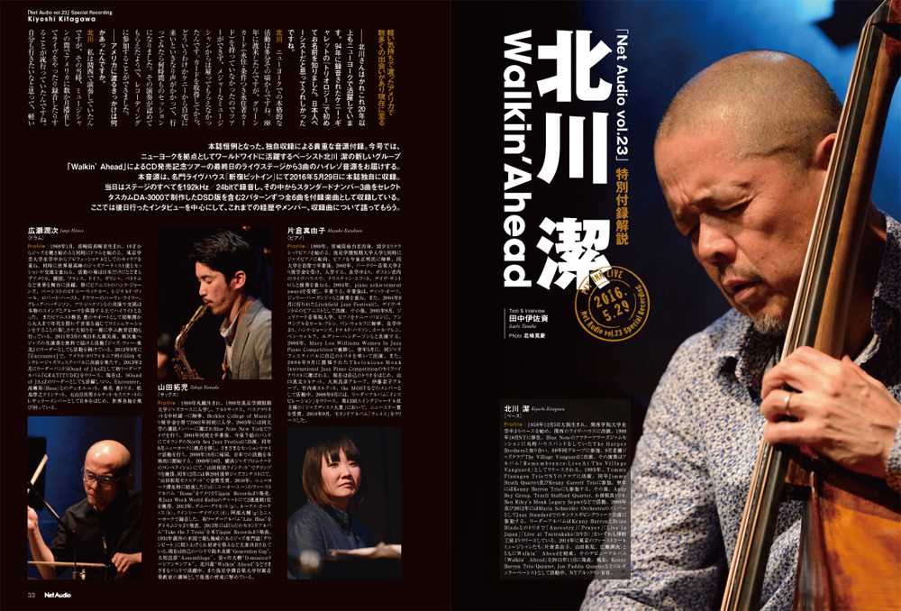 毎回恒例となった、本誌と新宿の名門ジャズ・ライヴハウス「新宿ピットイン」のコラボレーションによるハイレゾ・ライヴレコーディング企画。今回は、ニューヨークを拠点として、現代ジャズシーンを語るに欠かせないミュージシャン達と共にさまざまな作品をリリースしているベーシスト、北川潔が登場! 同氏がリーダーを務めるWALKIN’AHEADが2016年5月29日に行った新宿ピットインでのジャパンツアー最終日の演奏を、192kHz/24bitでライヴレコーディングしました。収録されるのは、MY LITTLE SUEDE SHOESとORNITHOLOGYといったチャーリー・パーカーのナンバーとジョージ・ガーシュウィンのスタンダード曲、EMBRACEABLE YOU。北川潔WALKIN’AHEADらしいソリッドかつグルーヴィーなプレイを、ぜひハイレゾでご堪能ください。