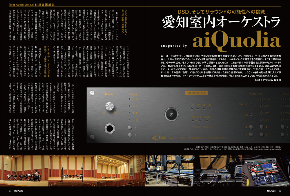 いま、大きな注目を集めているDSDフォーマットですが、レコーディングの面から見ればまだまだたくさんの課題があります。そんな現状を受け、高音質レーベル「エタンデュ」を運営するアイクオリアが開発したのが、AD/DAコンバーター「I88AD-U1」です。今回は満を持して登場するこのAD/DAコンバーターを活用したDSDマルチトラック音源を付録で用意! 収録されるのは、愛知室内オーケストラによる『ラヴェル:クープランの墓より「リゴードン」』。DSDによるステレオ音源のほか、フロントハイトスピーカーを加えた5.0ch 3Dサラウンドバージョン等を用意するという極めて実験的な試みとなっております。なぜ、アイクオリアがDSD対応AD/DAコンバーターを開発したのか、そして3Dサラウンドの魅力とはどのようなものなのか。ほかでは味わえないハイレゾの発展性を示す貴重な音源を、ぜひ一度ご体感ください。