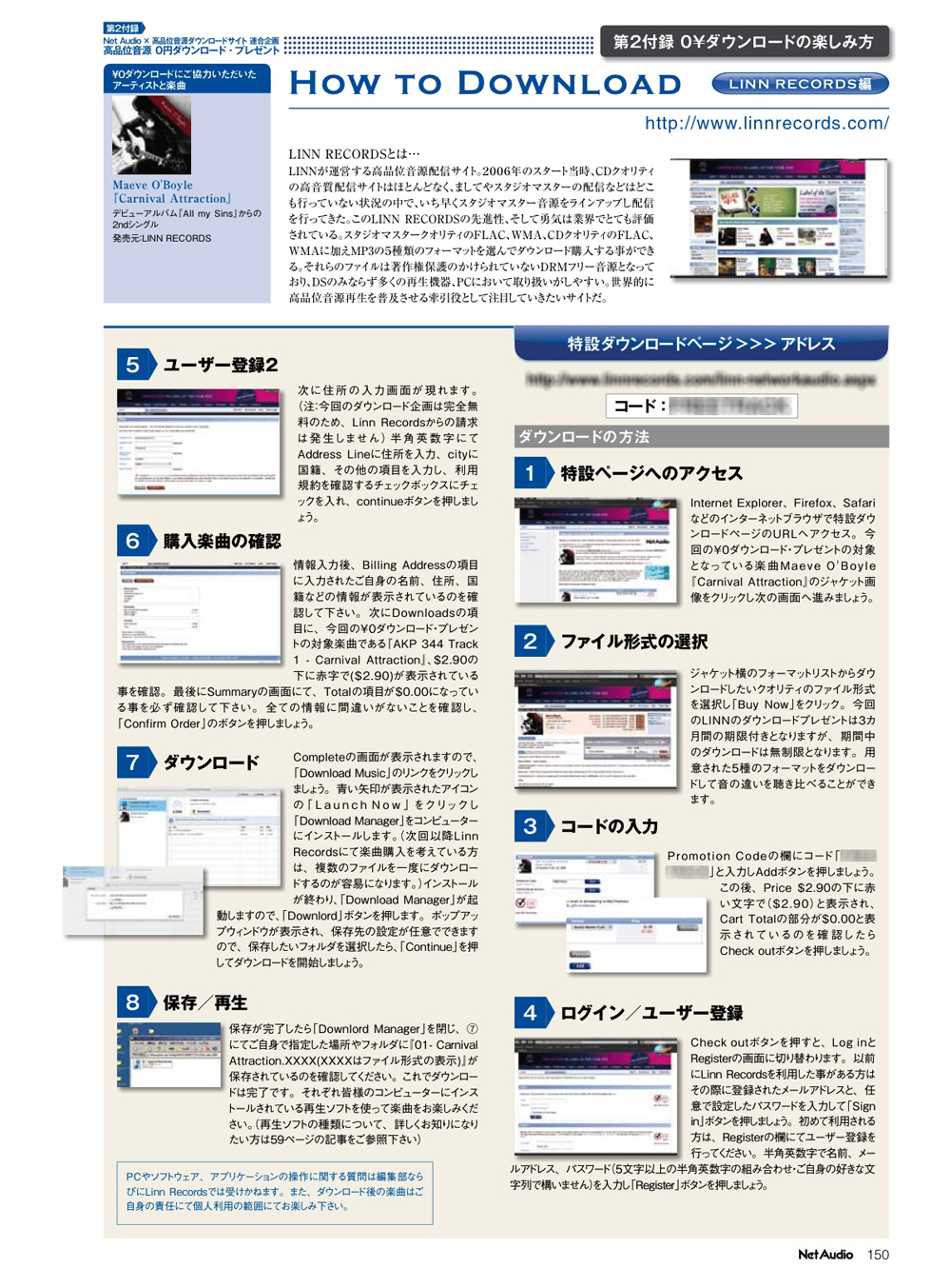 第2付録は各高音質配信サイトによる「0円ダウンロード」企画。リンレコーズ、ototoy、e-onkyoよりご提供いただいた魅力的な楽曲を、無料でダウンロードできるというもの。誌面上に案内された各サイトにアクセス。ダウンロードする手順もわかりやすく解説しています。