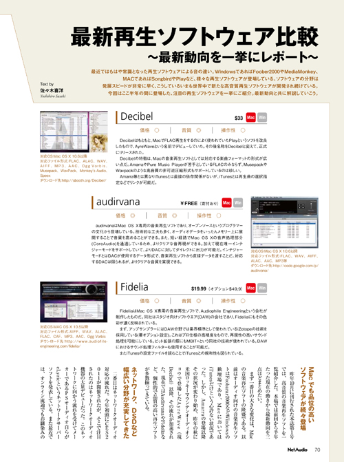 第1号でもたいへんな人気を呼んだ「再生ソフトウェア」解説、今回も、佐々木喜洋氏にご執筆いただきました。加えて、オーディオ評論家、小林貢氏がまるでオーディオ製品の比較試聴を行うように、再生ソフトウェアを比較試聴した記事も設けました。