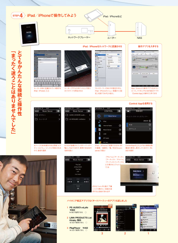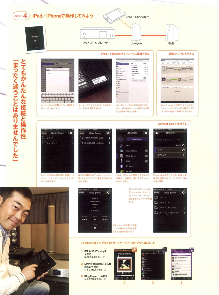 - 51ページPioneer N-50を使用しての「ネットワークプレーヤーのセットアップ」〜「iPadを使って操作しよう」の記事にて、iPad画面画像のひとつ(下から2段目の最右に位置する画像)に、関係のない画像が重なり、iPad画面画像が見えなくなってしまっております(下・左側のに示すとおり)。正しくは下・右側に示すような記事ページになります。