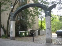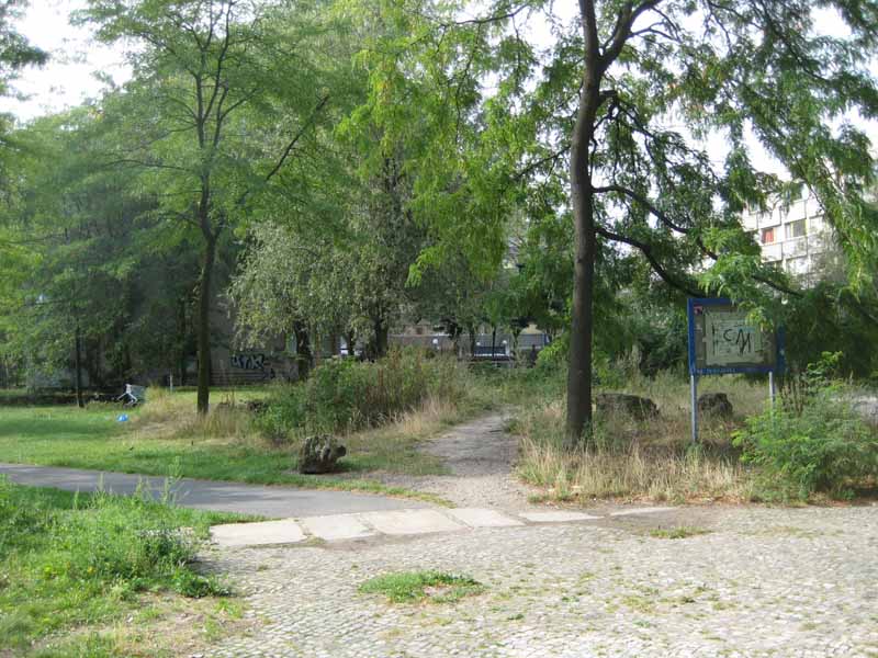 跡地の入り口には「DIESER WEG FUEHRT ZUM ORT DER ALTEN PHILHARMONIE 1882-1944」(この道は旧フィルハーモニーがあった場所へ続く、という意味)というプレートが埋められています。今でも新しい建物が建つことなく、ところどころにかつてのホールの遺構をうかがうことができました。