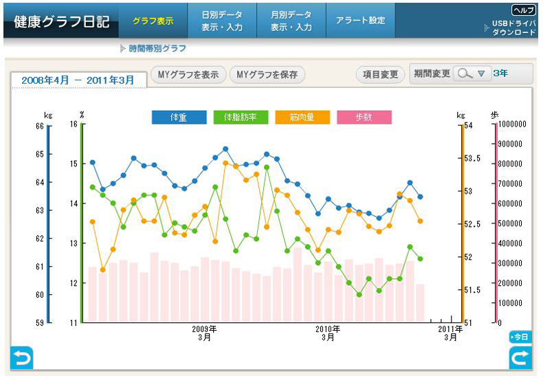 体組成計「BC-501」、歩数計「FB-723」、血圧計「BP-300」などの計測器とデータ転送用のリレーキー「KY-001」、さらに、「からだカルテ」利用がセットとなった商品提案も展開。体組成計で測定後、赤外線通信で自動的にリレーキーに転送される測定データを、リレーキーをUSB接続することで、タニタが運営する健康応援ネット「からだカルテ」サイトに転送。データは自動でグラフ化され、PCや携帯電話でデータを確認することができる。サイト上には、ダイエットを楽しく続けられるさまざまなコンテンツも用意されている