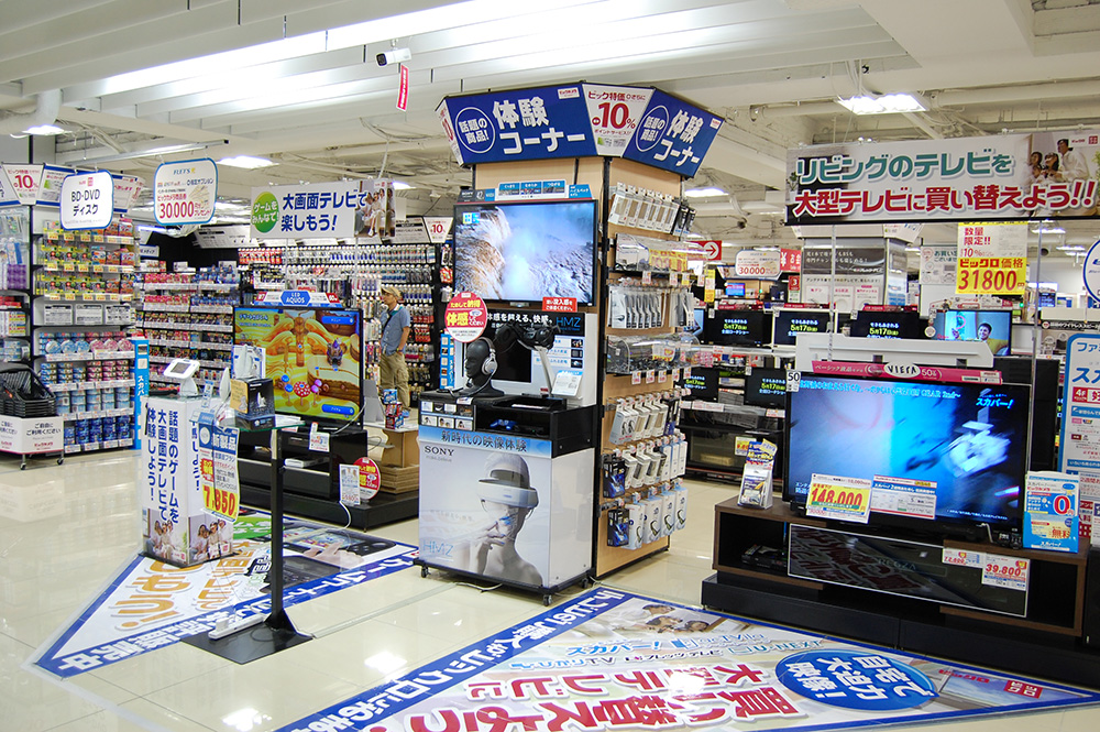 ユニクロとのコラボレーションとして、ユニクロの売り場には、それぞれの客層にあわせて家電を展示。興味を引く演出が施されている。ユニクロの男性コーナーには最新の大画面テレビを展示。4階ビジュアルコーナー主任・佐藤健氏は「やはり、最新のものはどんな進化をしているのかお父さんも気になるようで、一緒に来た家族と離れて、『ちょっと見に行ってくる』というケースも少なくありません」と語る。 |