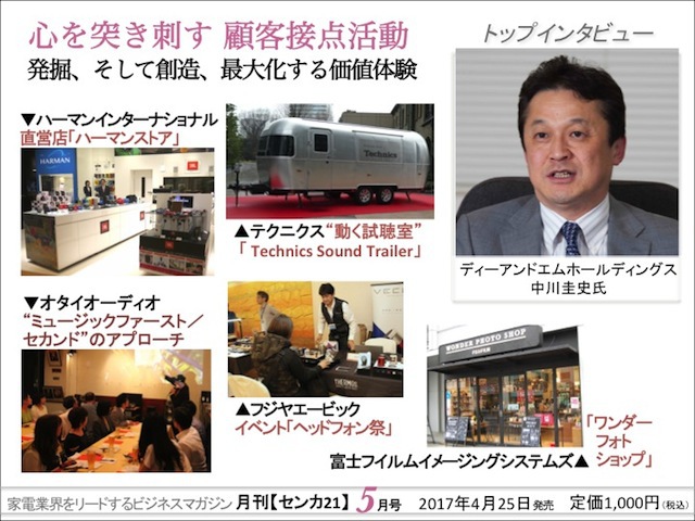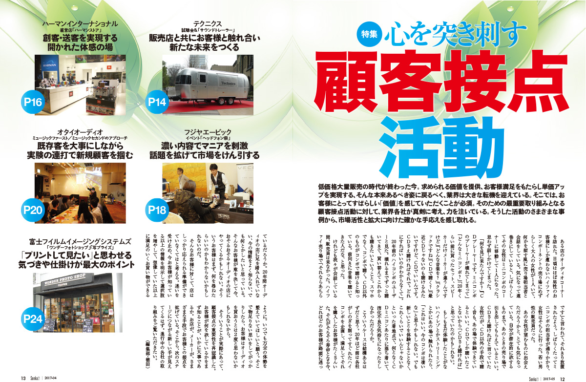巻頭言特集心を突き刺す 発掘、そして創造、最大化する価値体験 ■テクニクス 「Technics Sound Trailer」 ■ハーマンインターナショナル 直営店「ハーマンストア」 ■フジヤエービック 「ヘッドフォン祭」 ■オタイオーディオ ミュージックファースト&セカンドのアプローチ ■富士フイルムイメージングシステムズ 「ワンダーフォトショップ」「写プライズ」他 ■トップインタビュー