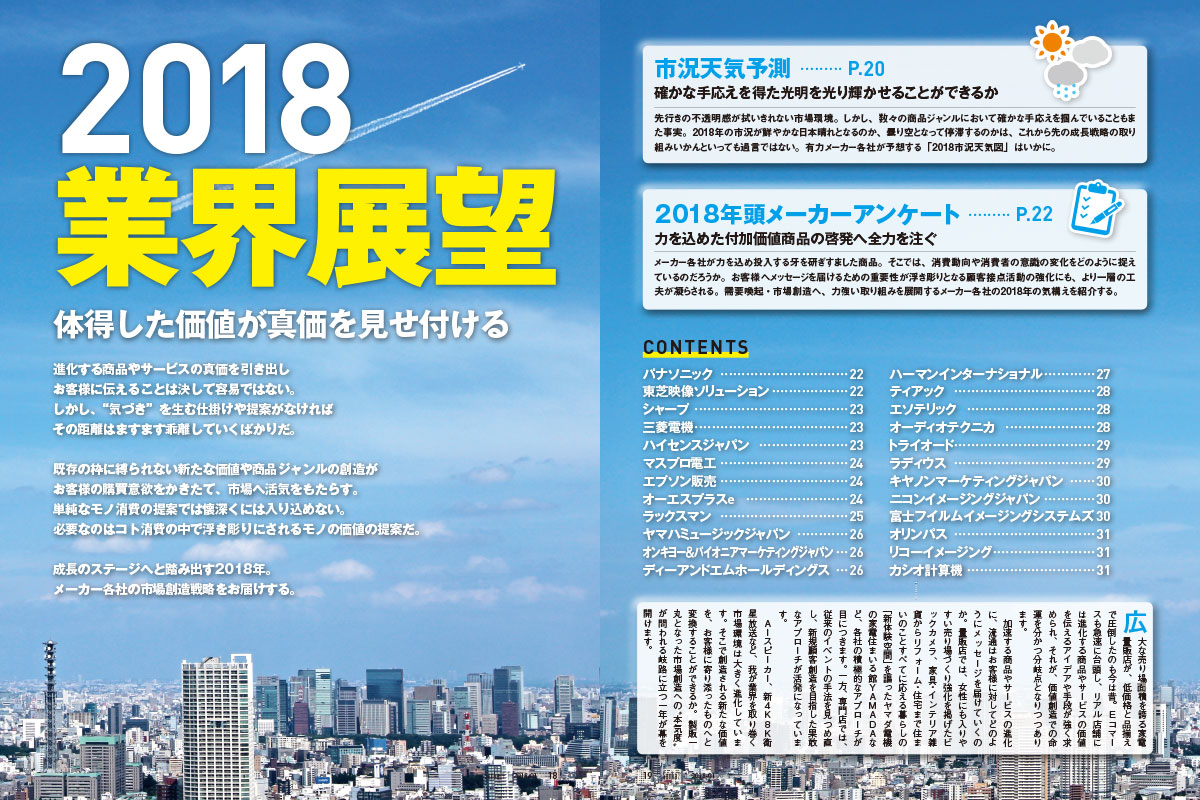 ■年頭メーカーアンケート 力を込めた付加価値商品の啓発へ全力を注ぐ パナソニック、東芝映像ソリューション、シャープ、三菱電機、ハイセンスジャパン、マスプロ電工、エプソン販売、オーエスプラスe、ラックスマン、ヤマハミュージックジャパン、オンキヨー&パイオニアマーケティングジャパン、ディーアンドエムホールディングス、ハーマンインターナショナル、エソテリック、ティアック、オーディオテクニカ、トライオード、ラディウス、キヤノンマーケティングジャパン、ニコンイメージングジャパン、富士フイルムイメージングシステムズ、オリンパス、リコーイメージング、カシオ計算機