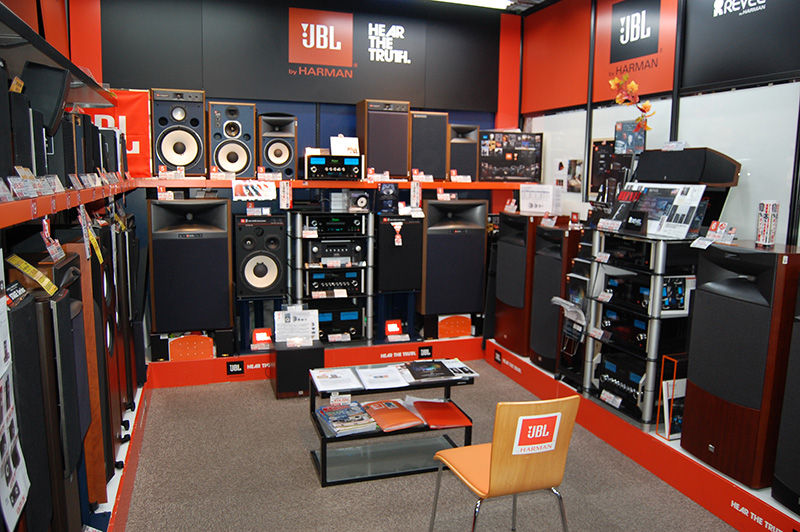 売り場を奥へと足を進めたところに試聴室を構え、ブランドごとに展開する。写真はJBL、REVELのスピーカーとMerk Levinsonのアンプ群が出迎える試聴ルーム