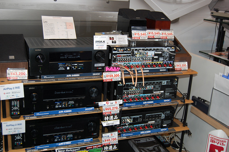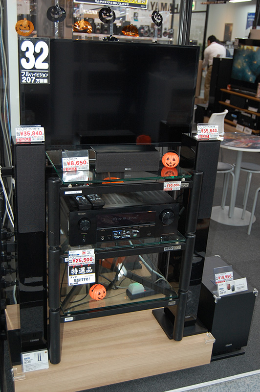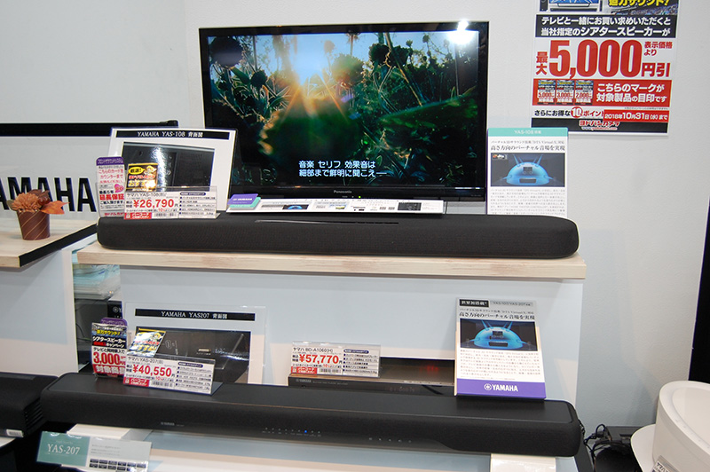 「本格的な臨場感が、今では2万円前後から手に入れることができます」とシアターバーの売上げが好調だ。テレビコーナーでは商談テーブルの前にシアターバーのコーナーを設ける。自然とその音に包み込まれる中で、さりげなくアピール。「50V型を超える大型テレビをお買い上げになった時点で有望なターゲットです」と付加価値啓発の仕組みが勝負のポイント。また、AVアンプでは「ブルートゥース機能内蔵で、ワイヤレスで手軽にハイレゾも楽しめるものもあります」と新たな楽しみ方の提案でターゲットを拡大する。