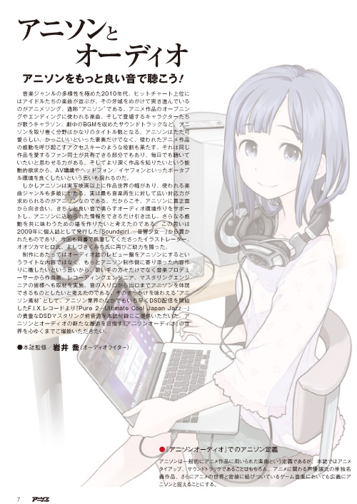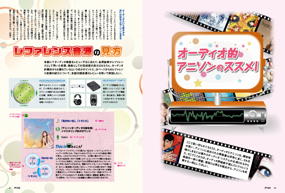 手持ちのアニソンCDをもっと豊かに楽しみたいという方、大好きなアーティストの声をじっくり味わいたいという方、ヘッドフォンは持っているけど本格的なオーディオシステムにも挑戦したいというユーザーの方まで、アニソンが大好き!という方ならばどなたでも楽しめる雑誌となっております。